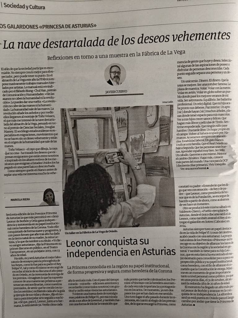 El artista asturiano Toño Velasco, por encargo de la Fundación Princesa de Asturias, confecciona estos días en Oviedo un mural con cientos de deseos de quienes por allí se acercan. Entre ellos, uno que hacemos muy nuestro en este blog. ¿Llegará?